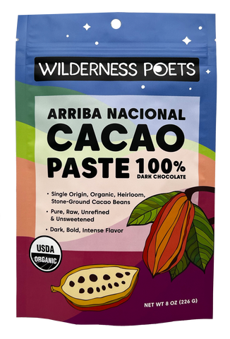 Wilderness Poets Cacao Paste is made from deeply flavorful, heirloom variety cacao beans. The cacao pods are hand-selected for quality beans, which are sun-dried then lightly fermented to bring out the rich, aromatic flavor. Once dried, the cacao beans are stone-ground, below 120° F, into a smooth paste. The cacao butter and powder are never separated from the bean. No other ingredients are added. This is the purest, unsweetened, raw cacao available.