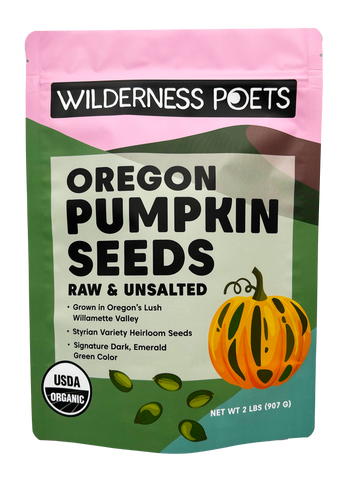 Wilderness Poets Pumpkin Seeds are raw, heirloom seeds grown in Oregon's lush Willamette Valley. We have been working exclusively with this pumpkin seed farm for over a decade. As much as 90% of Pumpkin Seeds found in Natural Food Stores are grown in China and are a pale green color. Our Oregon grown Pumpkin Seeds have a robust, fresh flavor that is incomparable. Learn more about USA grown vs. Chinese Pumpkin Seeds